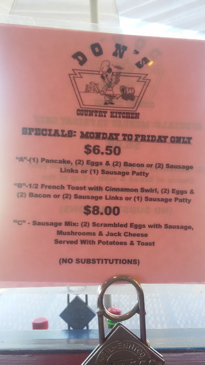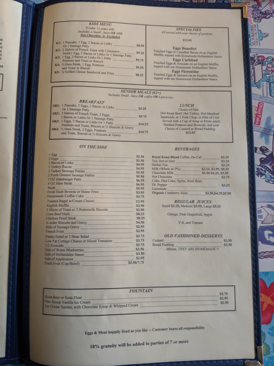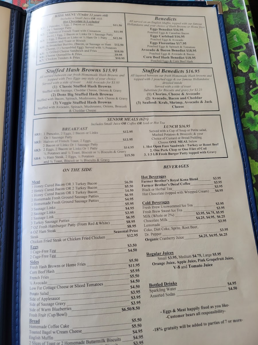 1 bacon or link, 1 egg, 1/2 potatoes, & toast or biscuit; add gravy for an additional charge.