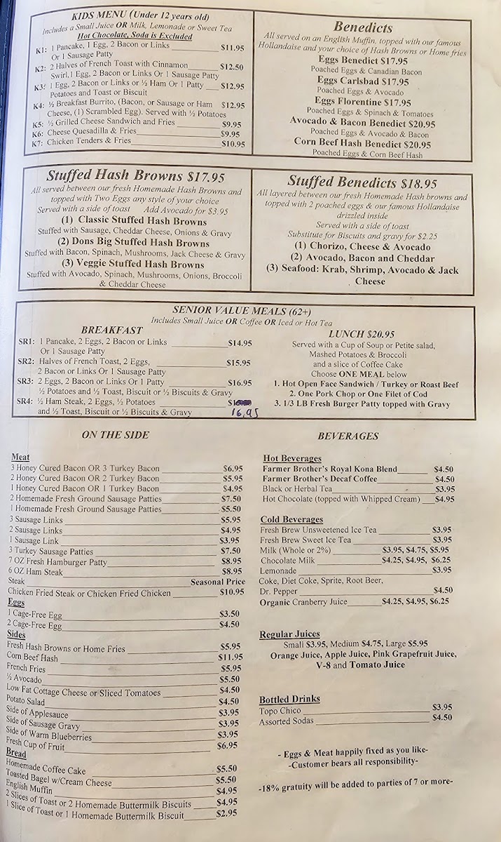 2 sausage patties, 2 eggs, biscuit and potatoes. All covered in our famous homemade country sausage gravy.